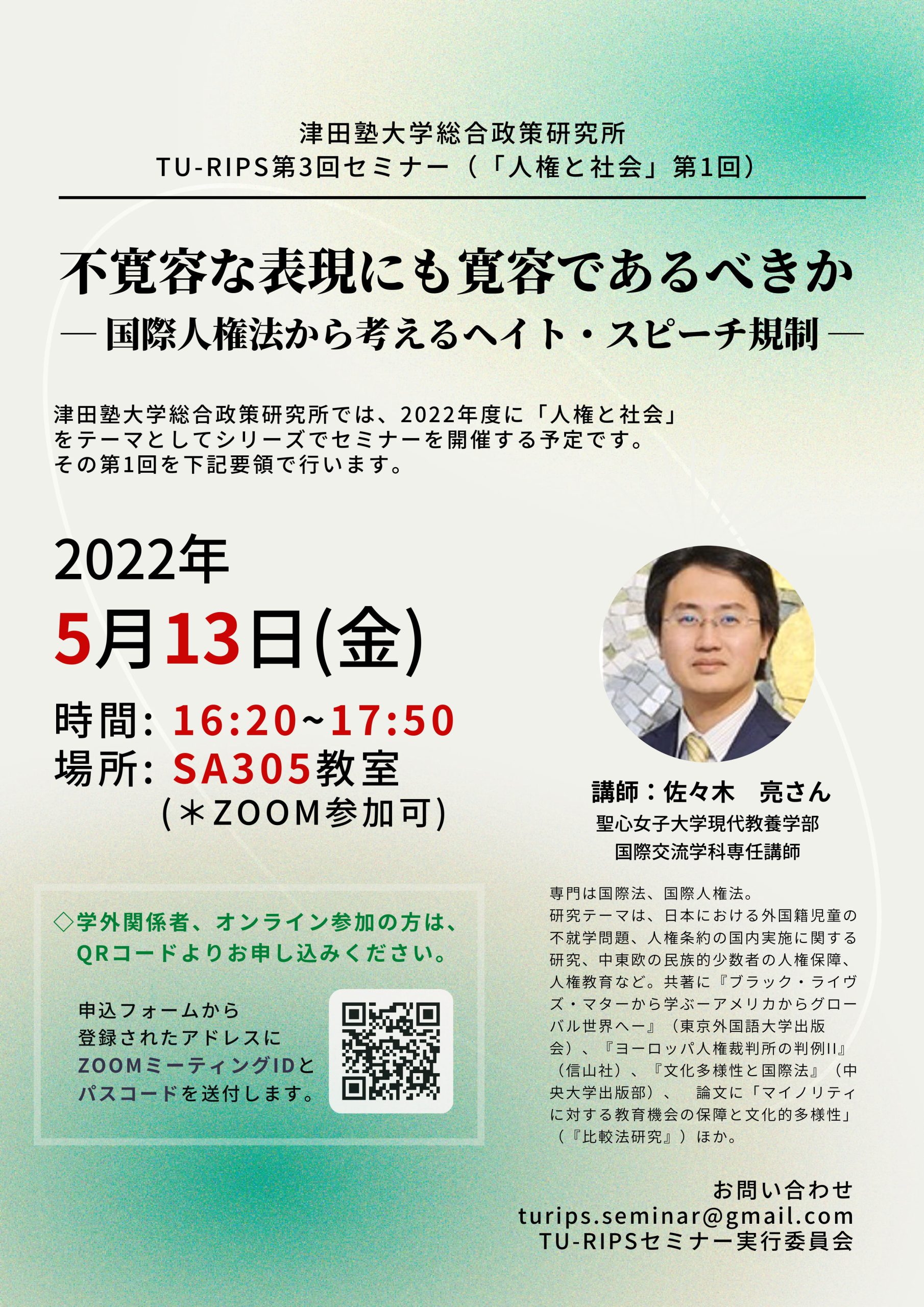 トップページ ご挨拶 研究員紹介 イベントのお知らせ 過去のイベント・録画 プロジェクト紹介 活動報告 総合政策研究所報 各年度版 総合政策研究所報 随時発刊分 2024年度〜 2023年度 2021年度〜2022年度 2019年度〜2020年度 教職員・学生の方へ └ 研究所報 執筆要項 白書・審議会データベース お問い合わせ プライバシーポリシー クッキーの取り扱い トップページ ご挨拶 研究員紹介 イベントのお知らせ 過去のイベント・録画 プロジェクト紹介 活動報告 総合政策研究所報 各年度版 総合政策研究所報 随時発刊分 2024年度〜 2023年度 2021年度〜2022年度 2019年度〜2020年度 教職員・学生の方へ └ 研究所報 執筆要項 白書・審議会データベース お問い合わせ プライバシーポリシー クッキーの取り扱い トップページ ご挨拶 研究員紹介 イベントのお知らせ 過去のイベント・録画 プロジェクト紹介 活動報告 総合政策研究所報 各年度版 総合政策研究所報随時発刊分 2024年度〜 2023年度 2021年度〜2022年度 2019年度〜2020年度 教職員・学生の方へ └ 研究所報 執筆要項 白書・審議会データベース お問い合わせ プライバシーポリシー クッキーの取り扱い 2022.05.13 TU-RIPS 第3回セミナー「人権と社会」シリーズ第1回 佐々木亮氏「国際人権法から考えるヘイト・スピーチ規制 (2022年5月13日開催)」報告 2022 年度津田塾大学総合政策研究所 TU-RIPS 第 3 回セミナー「人権と社会」シリーズ第1回 、佐々 木亮氏「不寛容な表現にも寛容であるべきか −国際人権法から考えるヘイト・スピーチ規制− (2022年5月13日開催)」ポスター 講師プロフィール TU-RIPS 第3回セミナー「人権と社会」シリーズ第1回 、佐々木亮氏「国際人権法から考えるヘイト・スピーチ規制 (2022年5月13日開催) 報告書