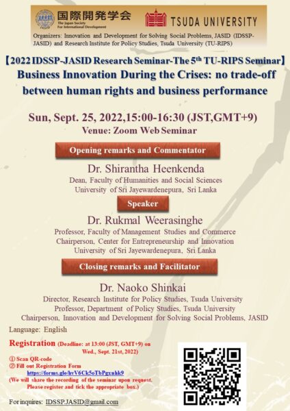 TU-RIPS第5回セミナー(「人権と社会」第3回)「Business Innovation during Crises in Sri Lanka: no trade-off between human rights and business performance」