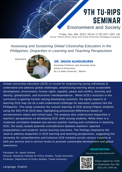 TU-RIPS第9回セミナー “Assessing and Sustaining Global Citizenship Education in the Philippines: Disparities in Learning and Teaching Perspectives,” (2023年12月8日開催)報告