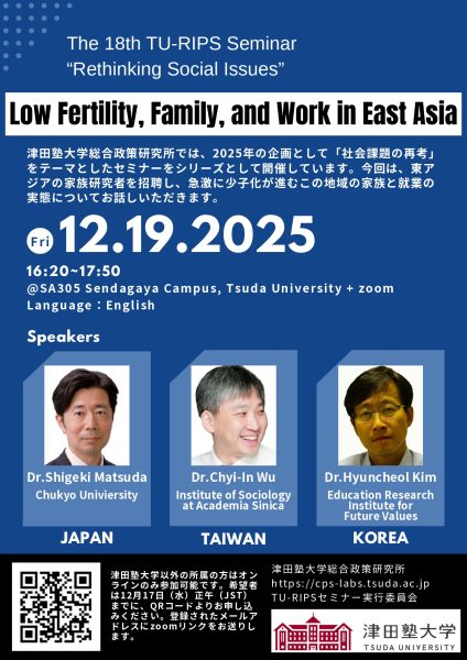The 18th Tsuda University, Research Institute for Policy Studies / TU-RIPS seminar will be held.